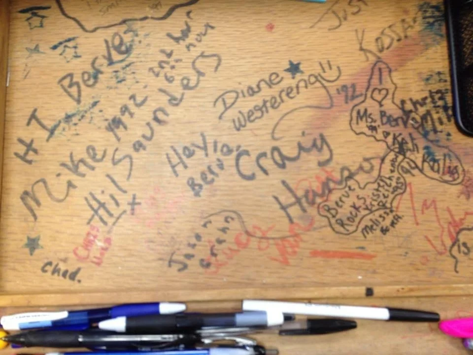 As life goes full circle, and with the hyper connectivity that exists with social media, I got the following picture from a classmate that was substitute teaching in our old school, using Leslie's desk. I forwarded the picture on to her, and it was one of our last emails. She loved it and printed it.