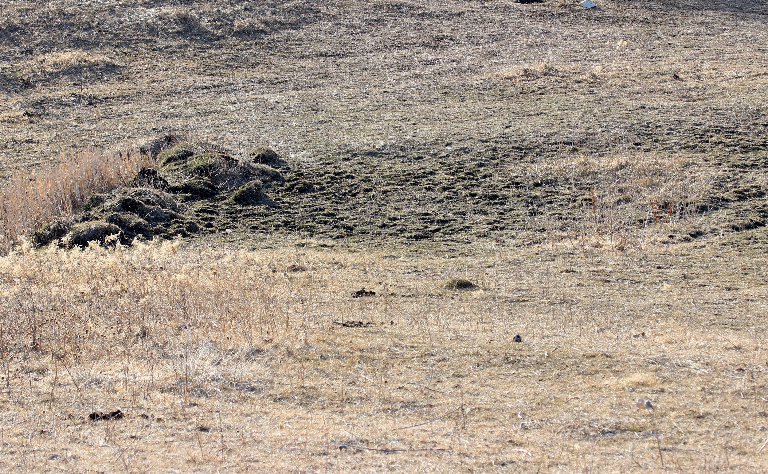 Fast forward to this spring and the field is trampled, grazed and so different. But the amazing thing I realized is what actually become visible thanks to this transformation. We had long suspected there was a spring, and thus the cause of the basement seepage, in the pasture hillside. Thanks to the horses, the drain-field of the spring is clearly visible.
