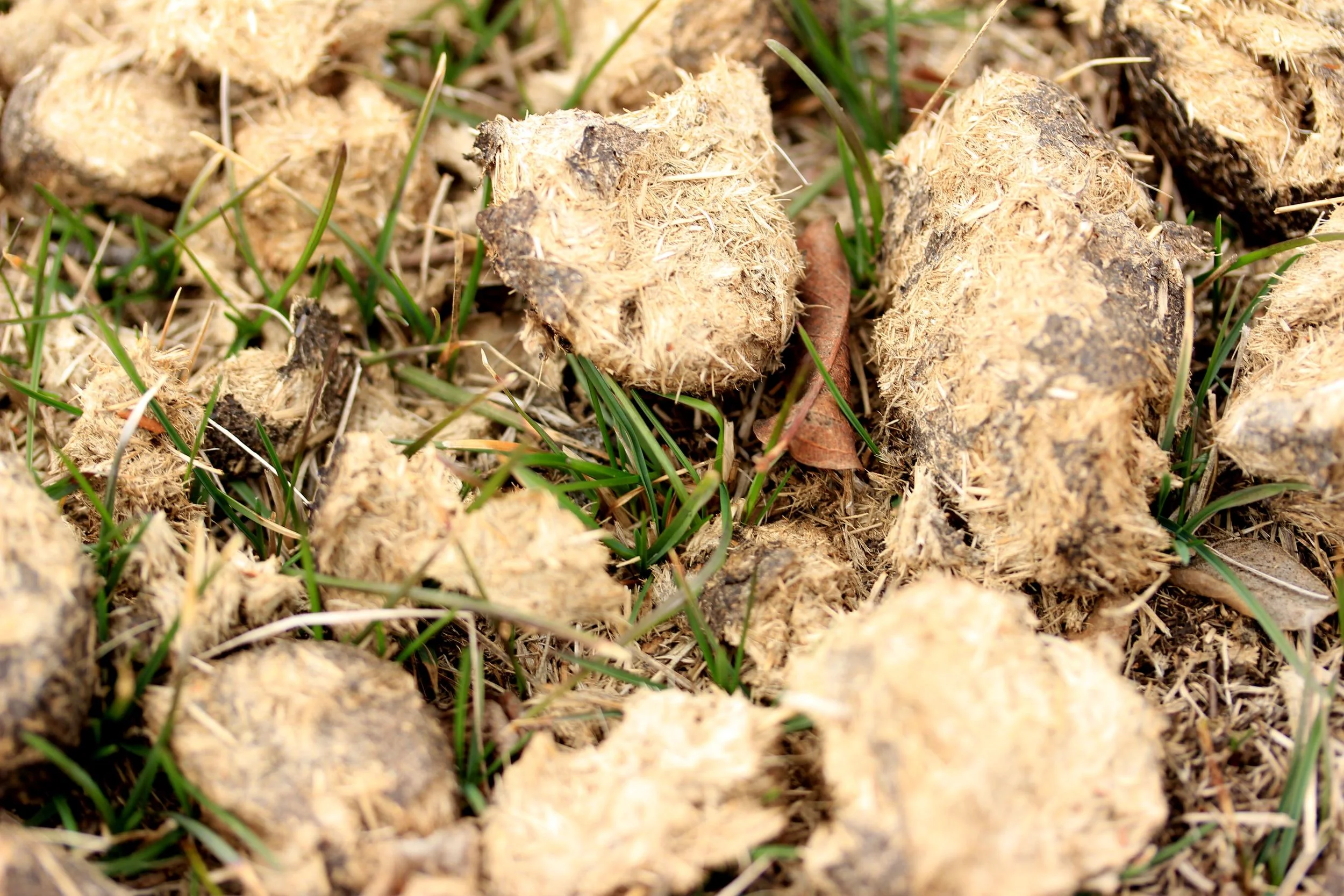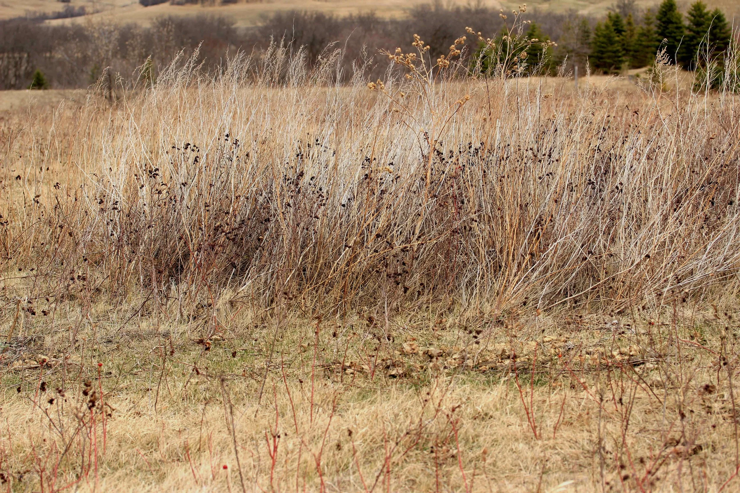 I meandered up into the pasture and was hopeful to see tiny blades of grass starting to turn green. In the vastness of beige the undertones of emerald made my heart happy. By last fall, the horses which were contained in the fences had done a great job of trampling and grazing a pasture that was long, long overdue for those tasks. As I wandered through the piles of horse manure and dead plants this composition began to take form in my brain.