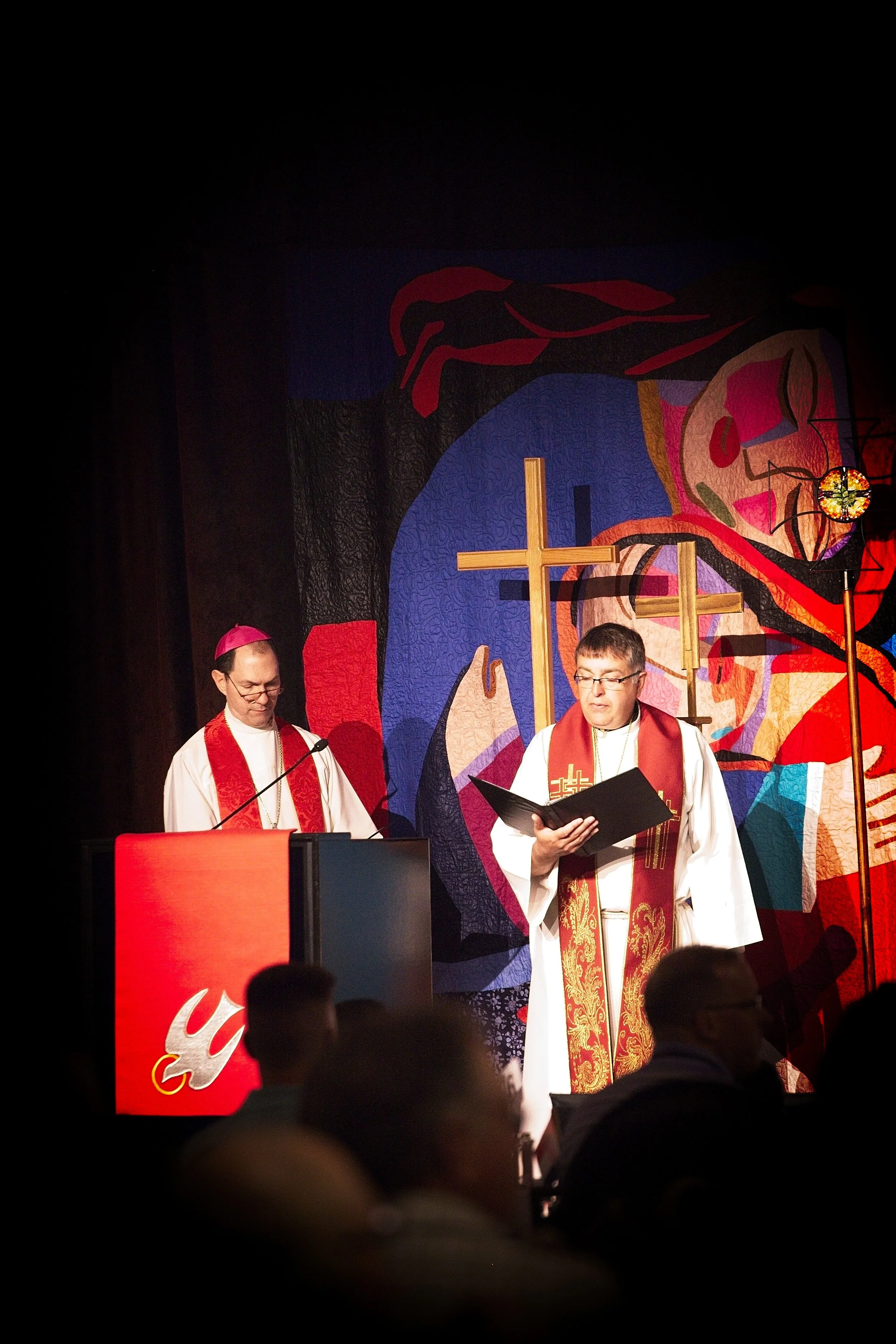 The Catholic Bishop and Lutheran Bishop, leading a service, together.
