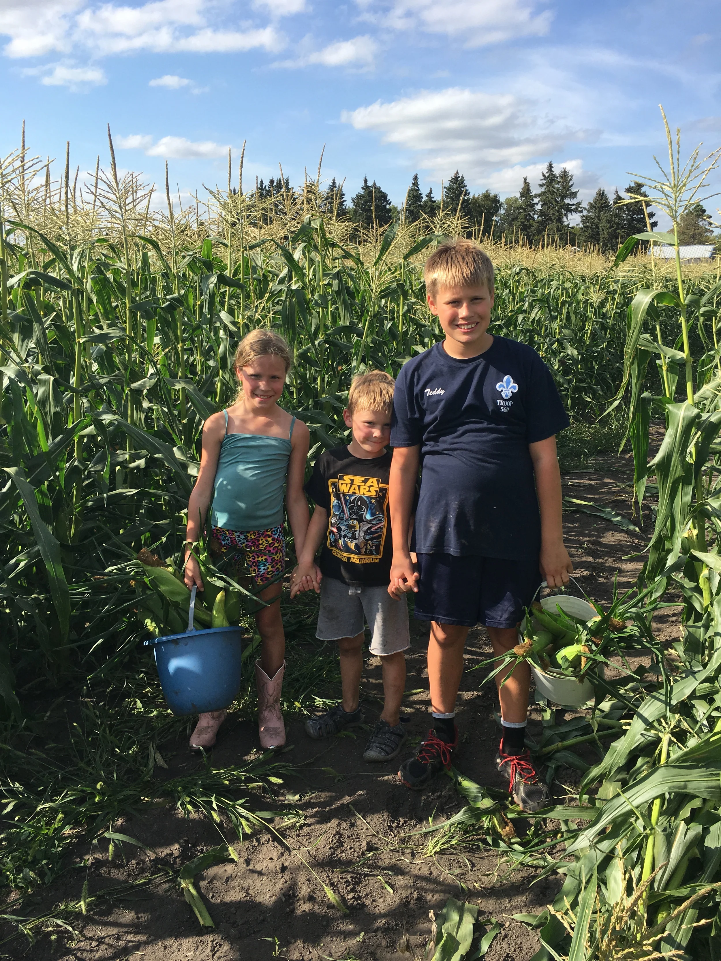 Moments after we arrived, a pickup pulled up and a spirited older man in thick glasses and floppy hat got out and introduced himself as Dan. I loved his energy immediately. As a refrigerator semi trailer purred in the background, he instructed us, the only volunteers that day, that we were going to be harvesting sweet corn and which cobs to pick. We headed to the acres of sweet corn, splitting the sections into rows of 5 at a time. My husband took the inner rows and the kids stuck to the outer rows, searching for the dark brown silk that indicated maturity. Armful by armful we loaded gigantic pallet boxes of corn.