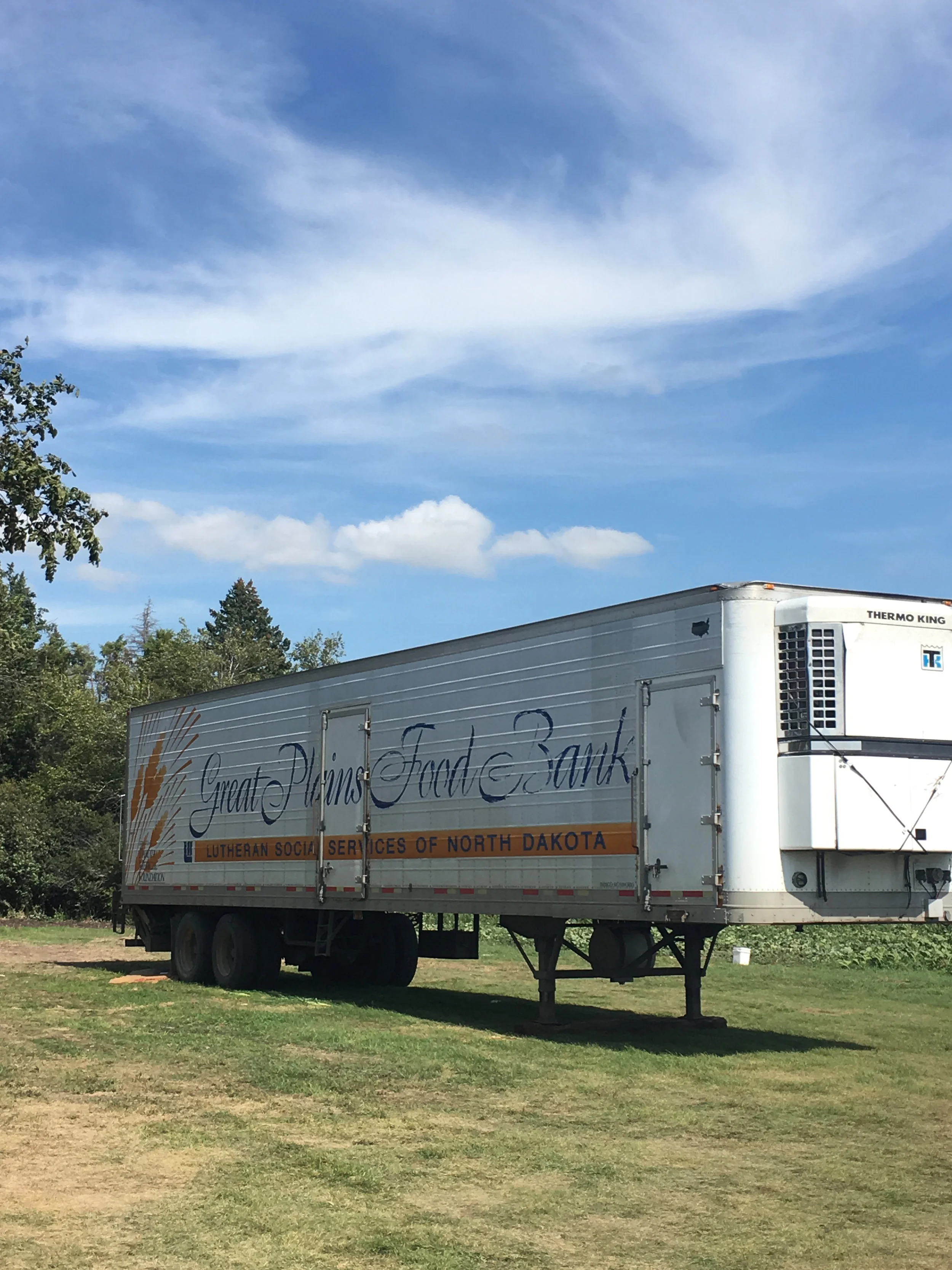 As we worked, Pastor Dan (who by this time had shared that he was a retired Lutheran pastor) told the story of how this mission came into being. He told of hearing the expected increased need for food due to a down-turned economy advertised on the radio. His first year he planted a few acres of squash on this land, which was his home place in which he grew up, with the purpose of donating to the local food bank in our community. After harvesting the squash, he learned our local food bank had no means of storing the squash and was pointed in the direction of the Great Plains Food Bank located in Fargo. This developed into a relationship that is now in its sixth year. Pastor Dan expressed great gratitude for (say what you will but...) Monsanto for donating the seed and the Great Plains Food Bank for parking a trailer that allows him and his volunteers to load on their own schedule. He has volunteers from the local college, VCSU, who harvest the acres of squash and several other volunteers and groups who help. So far this year, Dan reports he has shipped off over 50,000 pounds of food to the food bank.