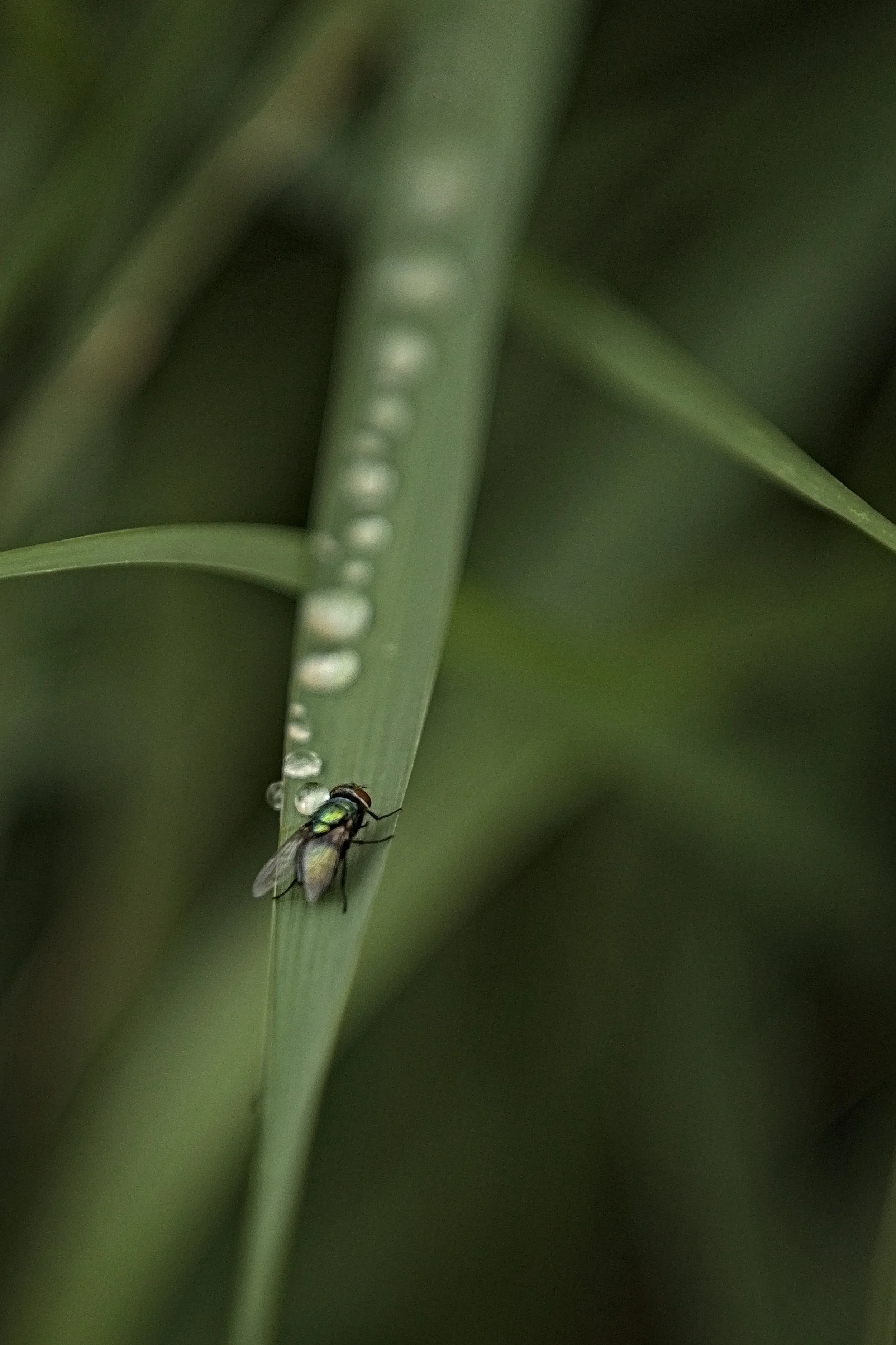 The rain had stopped and a fly pauses next to the droplets, oblivious of me and my camera.