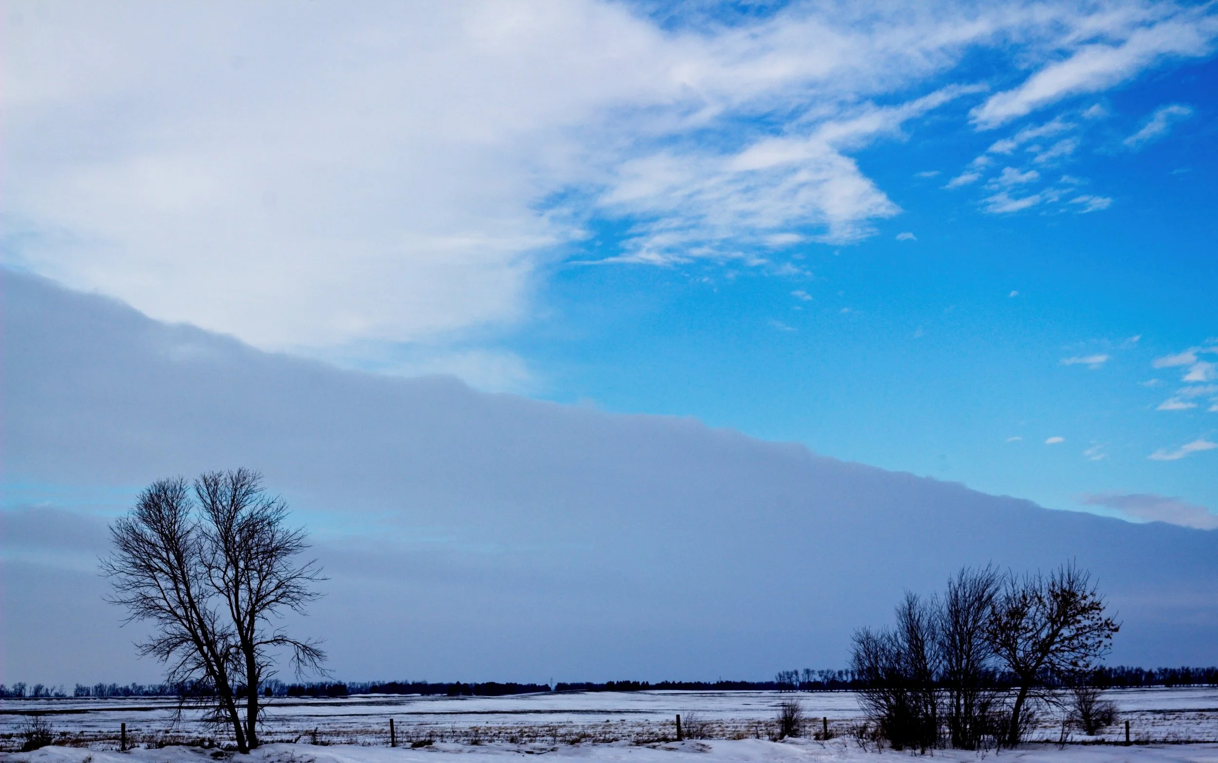 As I drove to Fargo, I was just ahead of the front. As I looked out my window I could see the drab grayness slowly starting to engulf the vivid blue sky. The contrast in the sky forced me to pull over and snap this image. To see nature and weather in action always forces me to pause. It is one force that will always be stronger than I.