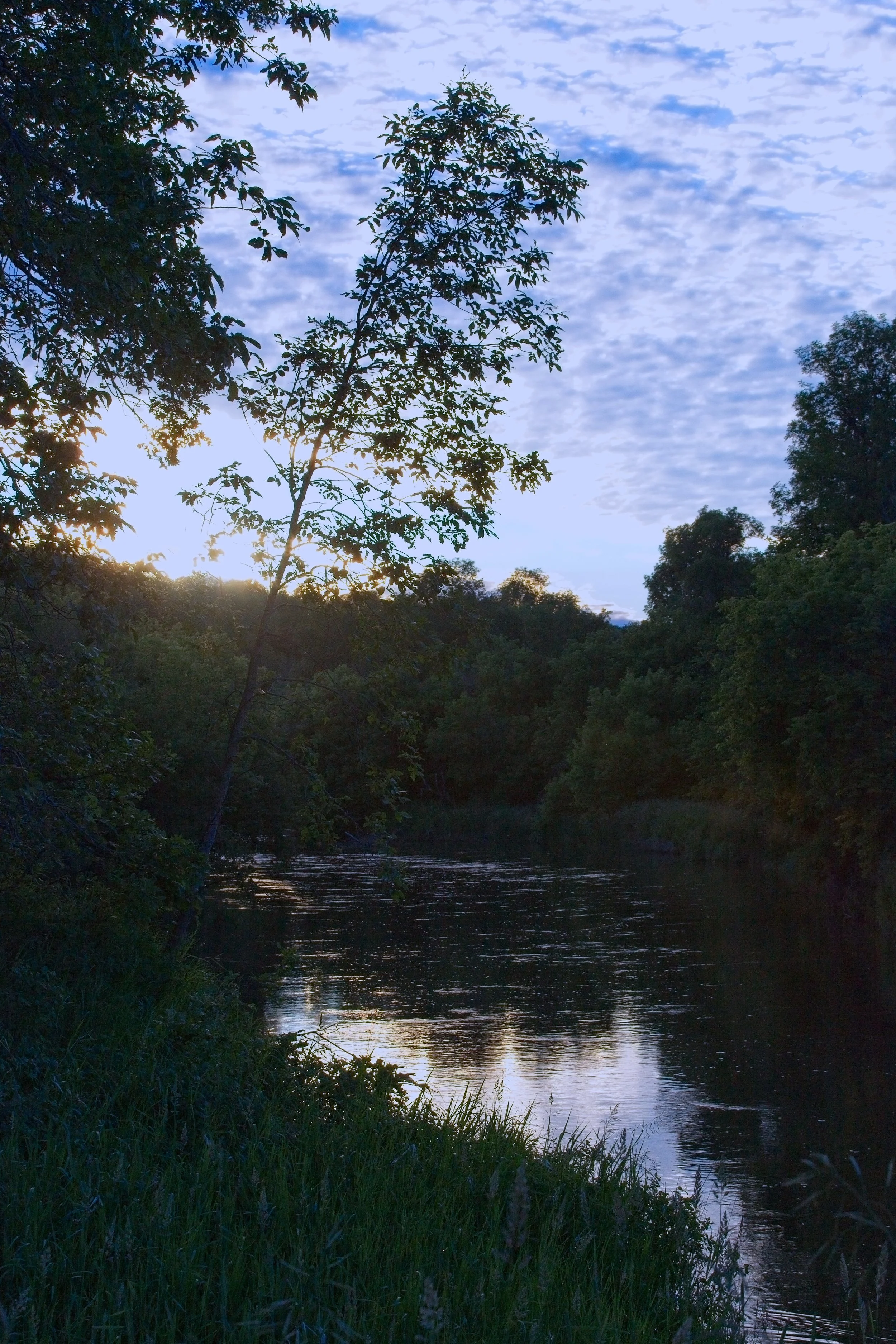 I sat by the river with Murphy, my dog, waiting for the sun to dip behind the trees. The golden light spilled over the trees and the river. The blue sky splattered with wispy white clouds. It was the perfect end to a wonderful summer day.