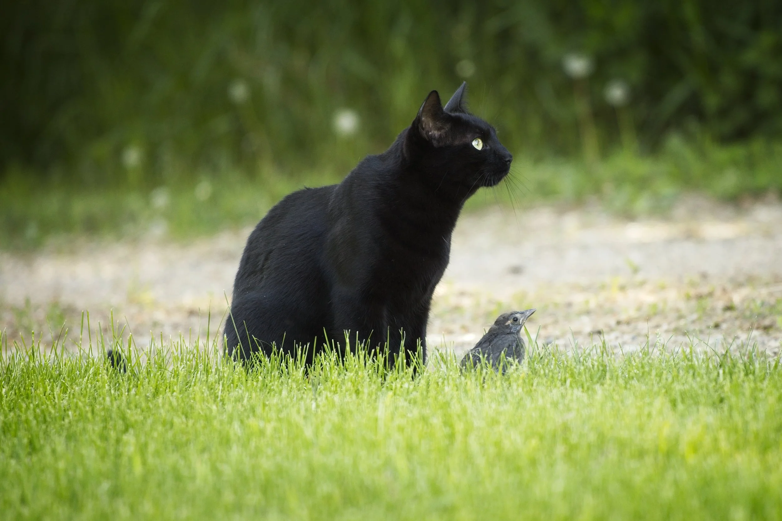 Tonight our yard was our own wild kingdom. Here our prairie panther stalked a young Grackle, after the poor bird had been dropped from the talons of a hawk who had attacked its nest. In this image, they are both looking at the surrounding trees as the flock of Grackles screamed at them.